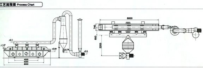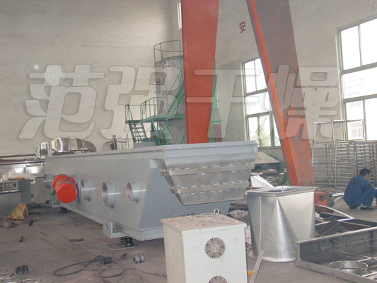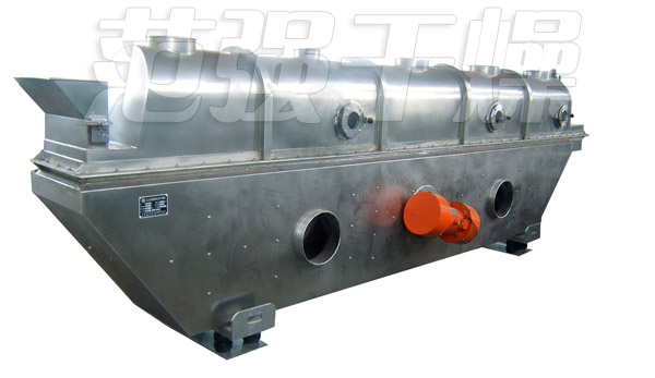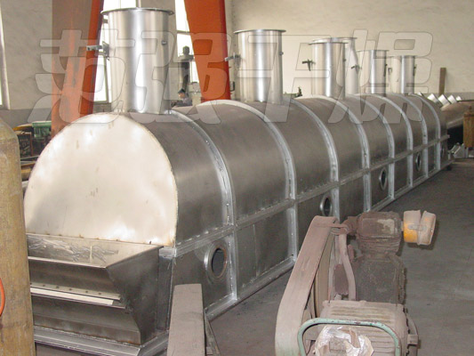 物料自進(jìn)料進(jìn)口進(jìn)入機(jī)內(nèi),在振動(dòng)力作用下,物料沿水平面流化床拋擲,向前連續(xù)運(yùn)動(dòng),熱風(fēng)向上穿過(guò)流化床同濕物料換熱后,濕空氣經(jīng)旋風(fēng)分離器除塵后由排風(fēng)1:3排出.干燥物料由排料進(jìn)口排出。