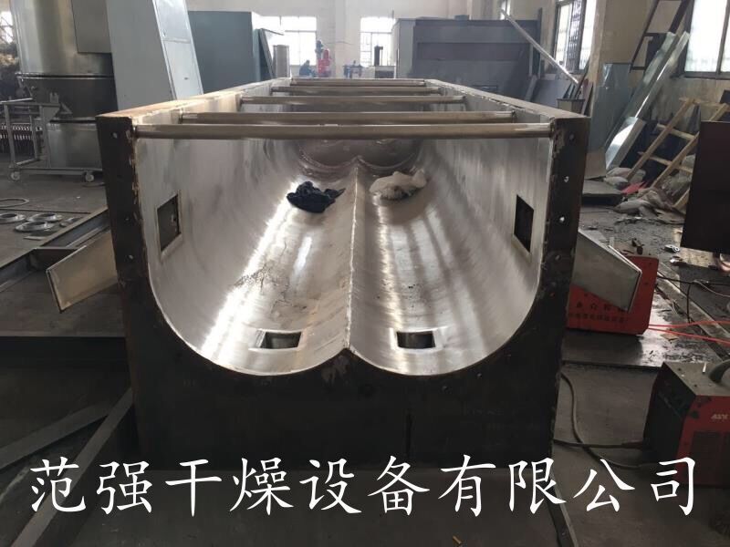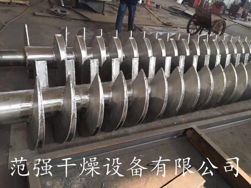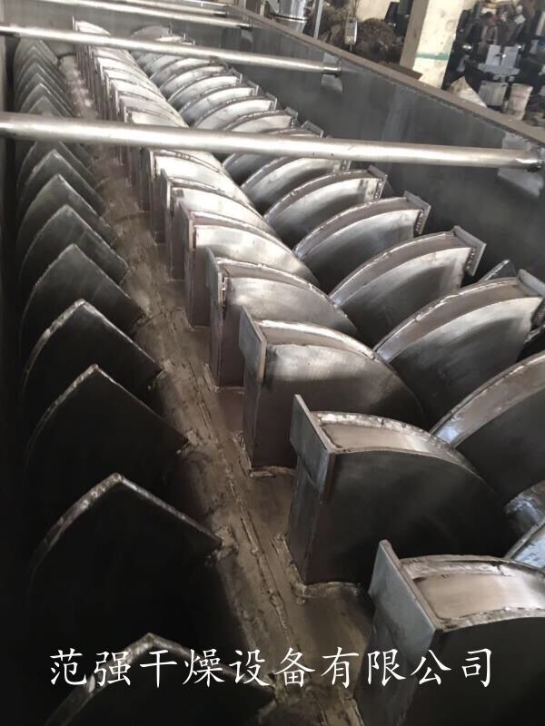 空心軸上密集排列著楔型中空漿葉,熱介質(zhì)經(jīng)空心軸流經(jīng)漿葉。單位有效容積內(nèi)傳熱面積很大,熱介質(zhì)溫度從-40℃到320℃,可以是水蒸汽,也可以是液體型:如熱水、導(dǎo)熱油等。間接傳導(dǎo)加熱,沒有攜帶空氣帶走熱量,熱量均用來加熱物料。熱量損失僅為通過器體保溫層向環(huán)境的散熱。楔型漿葉傳熱面具有自清潔功能。物料顆粒與楔型面的相對(duì)運(yùn)動(dòng)產(chǎn)生洗刷作用,能夠洗刷掉楔型面上附著物料,使運(yùn)轉(zhuǎn)中一直保持著清潔的傳熱面。漿葉干燥機(jī)的殼體為Ω型,殼體內(nèi)一般安排二到四根空心攪拌軸。殼體有密封端蓋與上蓋,防止物料粉塵外泄而充分發(fā)揮作用。