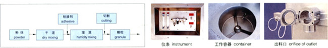 粉體物料與粘合劑在圓筒形容器中由底部混合漿充分混合成濕潤軟材,然后由側(cè)置的高速粉碎槳切割成均勻的濕顆粒。