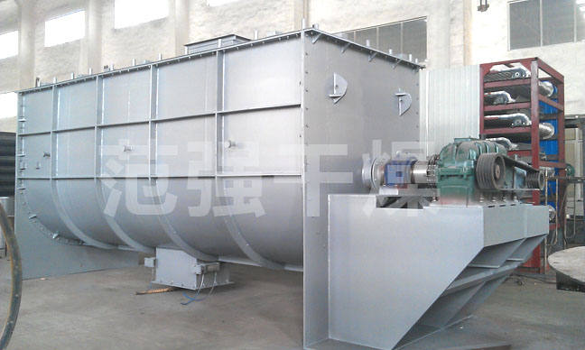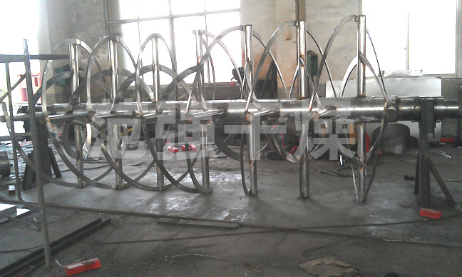 臥式螺帶混合機(jī)由容器、螺旋攪拌葉片和傳動(dòng)部件組成:螺旋葉片一般做成雙層或三層,外層螺旋將物料從兩側(cè)向中央?yún)R集,內(nèi)層螺旋將物料從中央兩側(cè)輸送,形成對(duì)流混合。